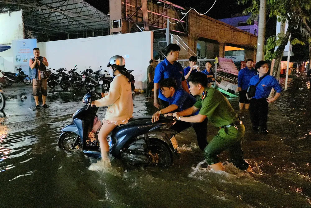 Lực lượng công an và đoàn viên thanh niên TP Cần Thơ hỗ trợ người dân gặp khó khăn trong triều cường. Ảnh: CAO PHONG