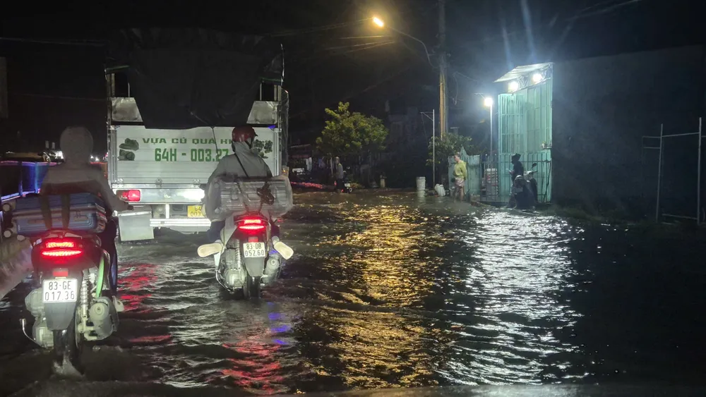 Triều cường đạt mức kỷ lục 2,33m vào tối 23-10 gây ngập nặng nhiều tuyến đường ở TP Cần Thơ. Ảnh: CAO PHONG