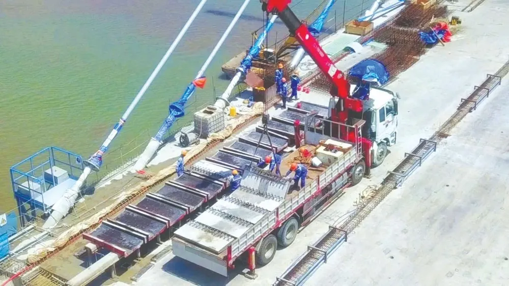 Nhộn nhịp thi công trên công trình Dự án cầu Rạch Miễu 2. Ảnh: NGỌC PHÚC