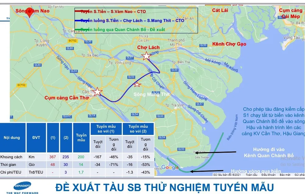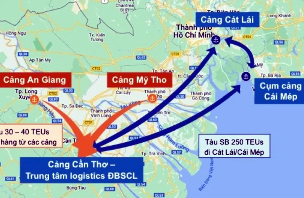 Tuyến mẫu thủy nội địa Cần Thơ - Cái Mép - Cát Lái được thiết kế sẽ xuất phát từ cụm cảng Cần Thơ đi qua các tỉnh ĐBSCL, đến khu cảng Cái Mép – Thị Vải (Vũng Tàu) qua Đồng Nai, vòng vào cảng Cát Lái (TP.HCM) và quay về Cần Thơ theo một chu trình khép kín. Nếu vận chuyển theo tuyến này, kết nối khu vực ĐBSCL với cảng nước sâu Cái Mép và cảng Cát Lái qua kênh Quan Chánh Bố, chiều dài toàn tuyến được rút ngắn còn khoảng 200 km. Chi phí vận chuyển theo tuyến này dự khoảng 3 triệu đồng/TEU.