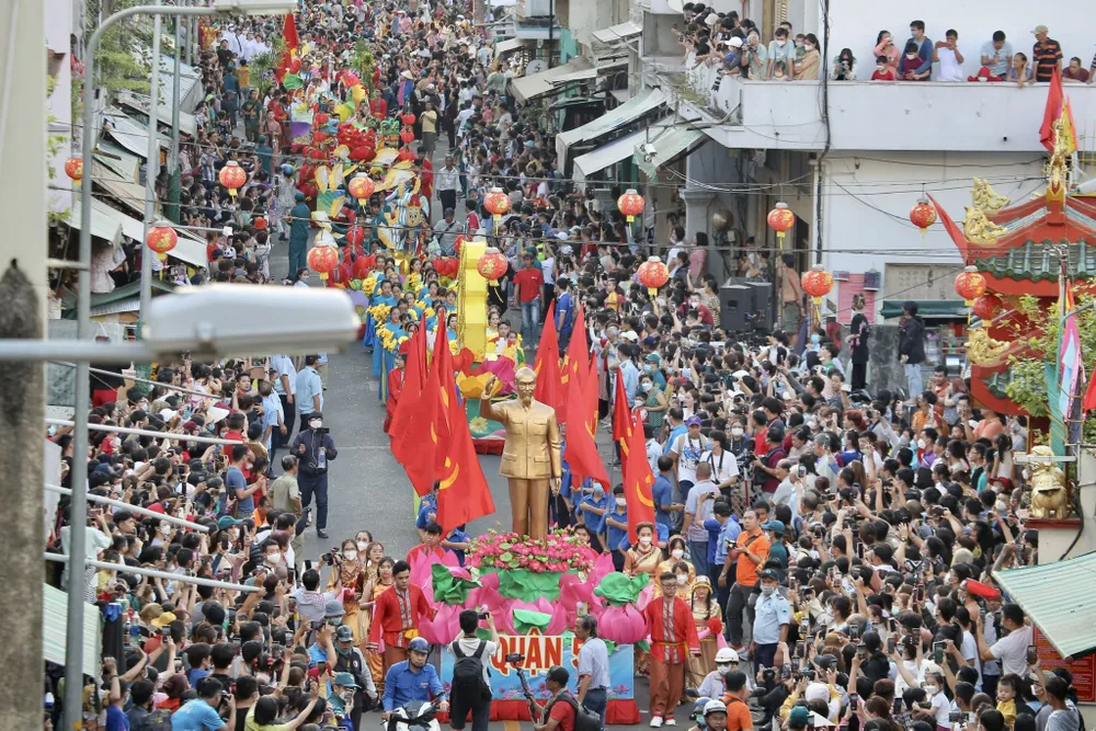 Vào chiều cùng ngày, từ 16 giờ 30 đến 18 giờ 30, trên các tuyến đường chính của quận 5, lễ diễu hành xe hoa đăng và biểu diễn nghệ thuật đường phố với sự tham gia của 1.200 diễn viên đã diễn ra tưng bừng, sôi nổi, rực rỡ và hấp dẫn, thu hút hàng ngàn người dân quan tâm theo dõi.