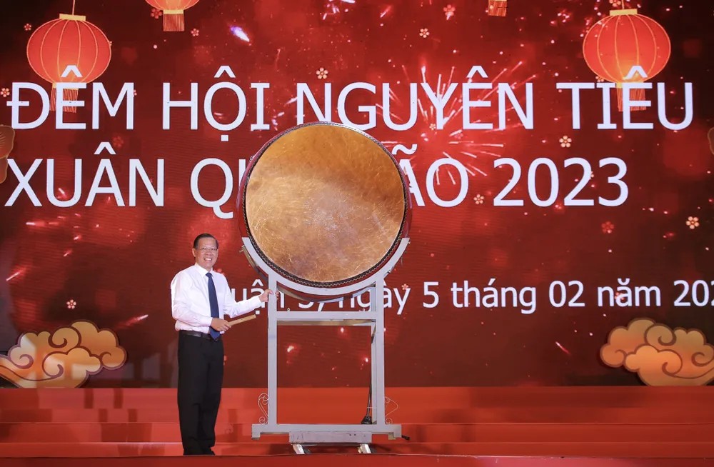 Chủ tịch UBND TPHCM Phan Văn Mãi đánh trống khai hội Đêm hội Nguyên tiêu Xuân Quý Mão 2023. Ảnh: DŨNG PHƯƠNG