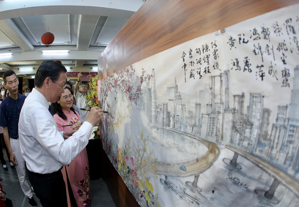 Chủ tịch UBND TPHCM Phan Văn Mãi và Chủ tịch HĐND TPHCM Nguyễn Thị Lệ cùng tham gia vẽ tranh thủy mặc tập thể trong đêm hội. Ảnh: DŨNG PHƯƠNG