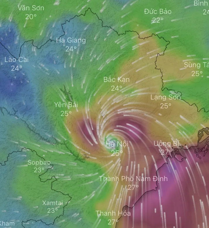 Sáng 6-9, trang Windy vẫn dự báo tâm bão quét vào Hà Nội. Nguồn: WINDY