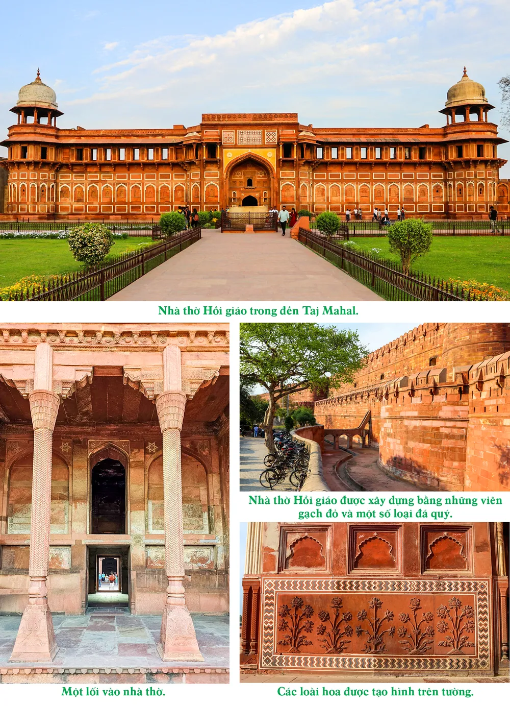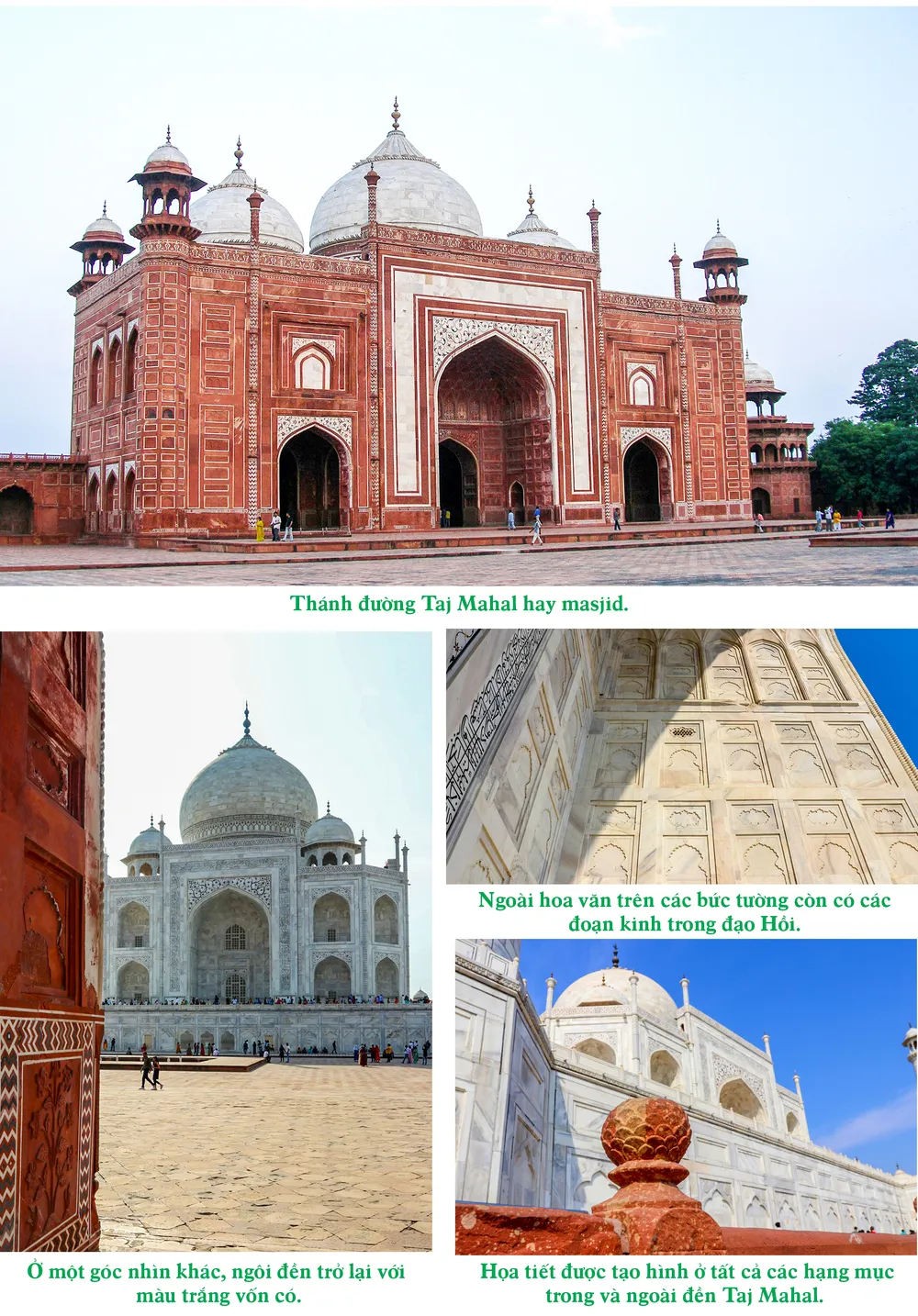 Lăng mộ Taj Mahal chỉ có một lối vào và một lối ra cho du khách, còn lại các cửa đều đóng. Vẻ đẹp của Taj Mahal còn nằm ở sự kết hợp khéo léo giữa các vật liệu rắn và khoảng trống, lồi và lõm cùng với nguyên liệu đá quý. Đền Taj Mahal có phong cách kiến trúc kết hợp giữa kiến trúc Ba Tư, Trung Á và Hồi giáo, bao gồm 5 khu: Darwaza (cổng chính), Bageecha (không gian vườn), Masjil (nhà thờ Hồi giáo), Naqqa Khana (nhà nghỉ) và Rauza (lăng Taj Mahal).