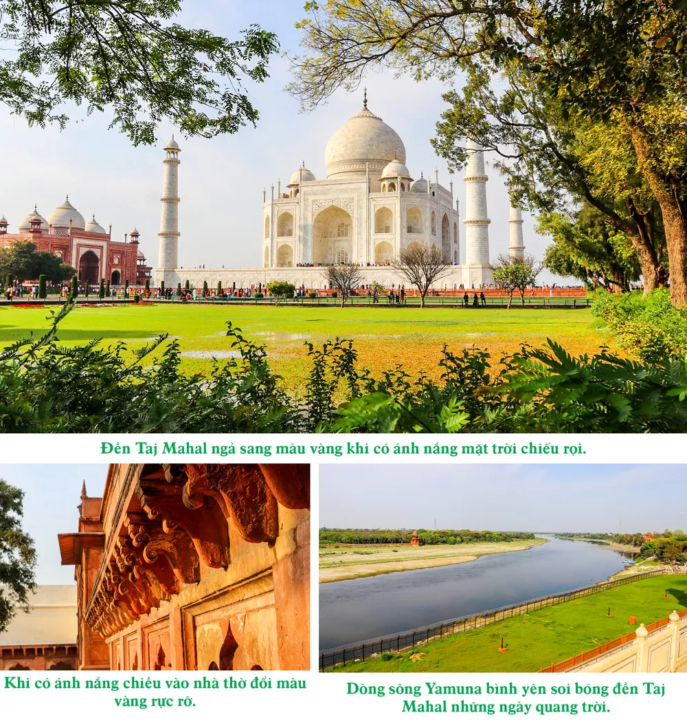 Vì vậy, đền Taj Mahal có thể đổi màu theo ánh nắng và thời tiết. Có những lúc sẽ thấy ngôi đền màu trắng sáng, có lúc sẽ có màu vàng nhạt và cũng có lúc có màu nâu đất. Ngôi đền Taj Mahal càng trở nên thơ mộng và trang nghiêm khi soi bóng dưới dòng sông linh thiêng Yamuna. Tuy nhiên gam màu trắng vẫn là gam màu thường thấy nhất ở đền Taj Mahal, màu trắng cũng thường là màu chủ đạo của các kiến trúc Hồi giáo. Đền Taj Mahal có lối kiến trúc đối xứng nhau rất hoàn hảo trên nền móng hình vuông. 2 bên sườn là nhà thờ Hồi giáo, trung tâm là ngôi đền với các mái vòm cân xứng nhau, giữa các mái vòm là một mái vòm lớn và cao nhất.