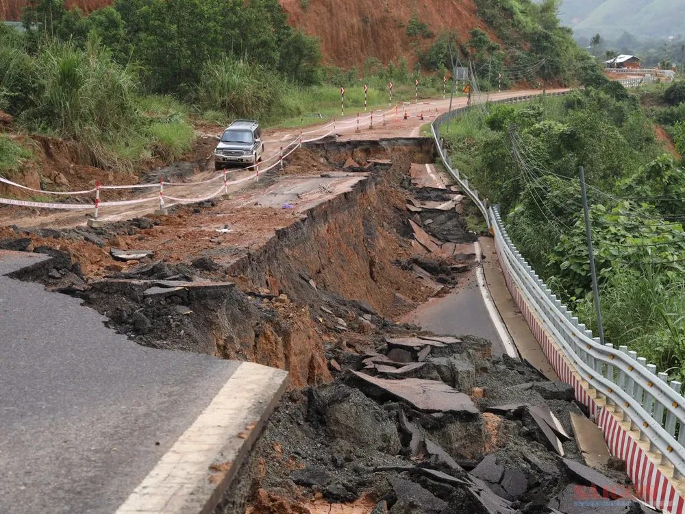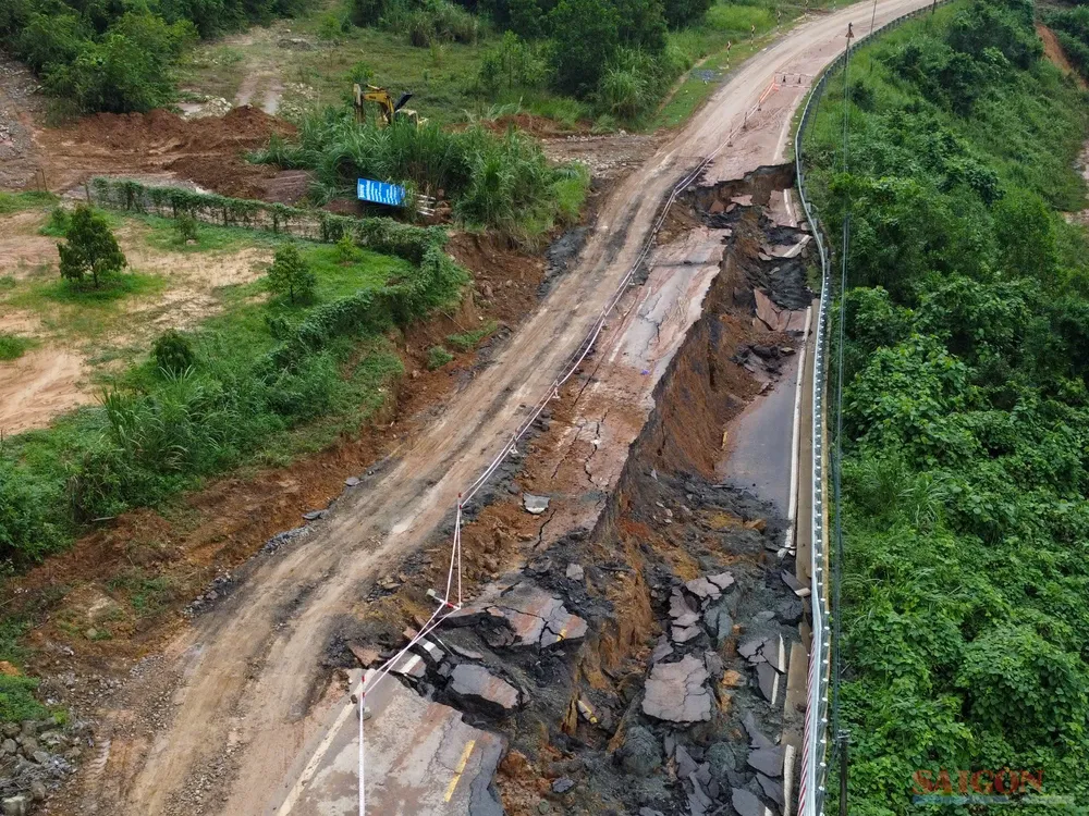 Mặt đường và taluy âm sụt lún dài 100m, rộng 10m, sâu khoảng 5m tại Km36+700. Ảnh: NHẬT THANH