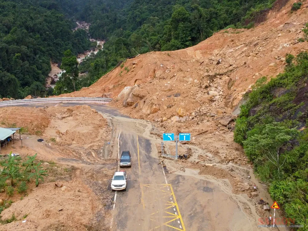 Đường cứu nạn trên đèo bị đất đá vùi lấp. Ảnh: HIẾU GIANG