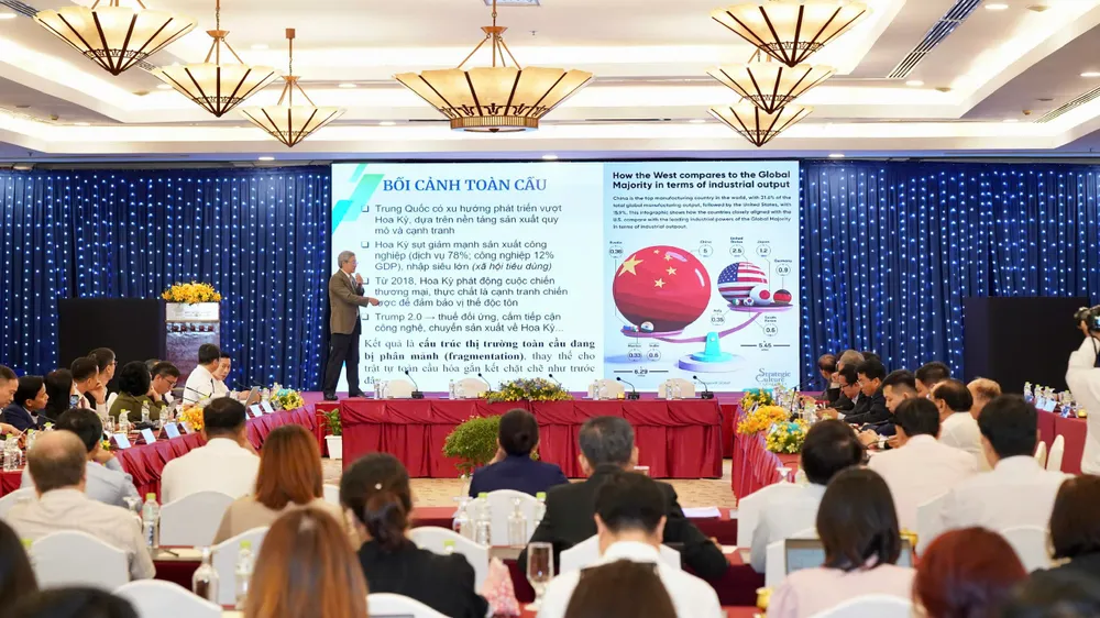 Phát biểu tại diễn đàn, ông Phạm Bình An, Phó Viện trưởng HIDS, cho biết: "Trật tự thế giới đã hình thành nên chuỗi cung ứng toàn cầu chặt chẽ. Trong đó, Trung Quốc nổi lên như một đối trọng với Hoa Kỳ. Trung Quốc có xu hướng phát triển vượt Hoa Kỳ dựa trên nền tảng sản xuất quy mô và cạnh tranh. Hoa Kỳ sụt giảm mạnh về sản xuất công nghiệp (dịch vụ 78%; công nghiệp 12% GDP), nhập siêu lớn, một xã hội tiêu dùng".