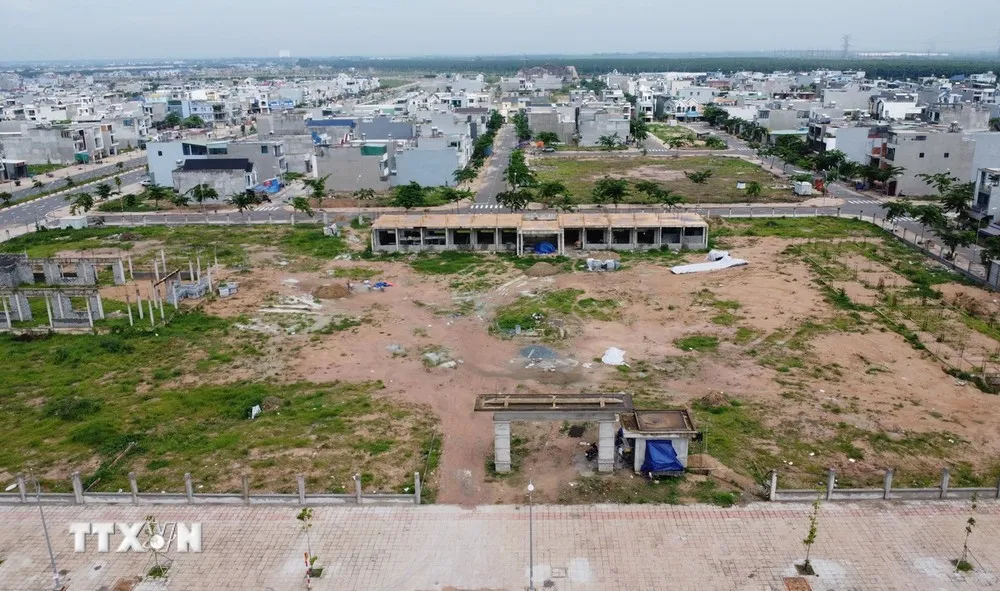Việc thi công nhiều công trình xã hội tại Khu tái định cư Lộc An-Bình Sơn bị ngưng trệ trong thời gian dài. (Ảnh: TTXVN phát)