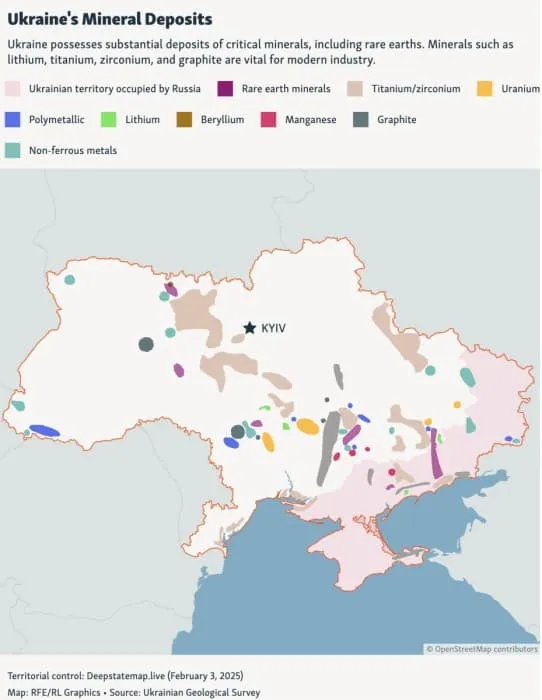 Hoa Kỳ đang tìm cách tiếp cận hơn 20 nguyên liệu thô được coi là có tầm quan trọng chiến lược đối với lợi ích của mình. Trong số đó có các mỏ titan, được sử dụng để chế tạo cánh máy bay và các sản phẩm hàng không vũ trụ khác, và uranium, được sử dụng cho năng lượng hạt nhân, thiết bị y tế và vũ khí. Ukraine cũng có các mỏ lithium, graphite và mangan, được sử dụng trong pin xe điện.