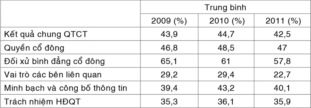 Theo báo cáo đánh giá, không doanh nghiệp nào đạt kết quả hài lòng vì toàn bộ điểm số QTCT đều dưới mức 60% và điểm bình quân của tất cả doanh nghiệp chỉ đạt 42,5% (năm 2010 là 44,7%, năm 2009 43,9%).