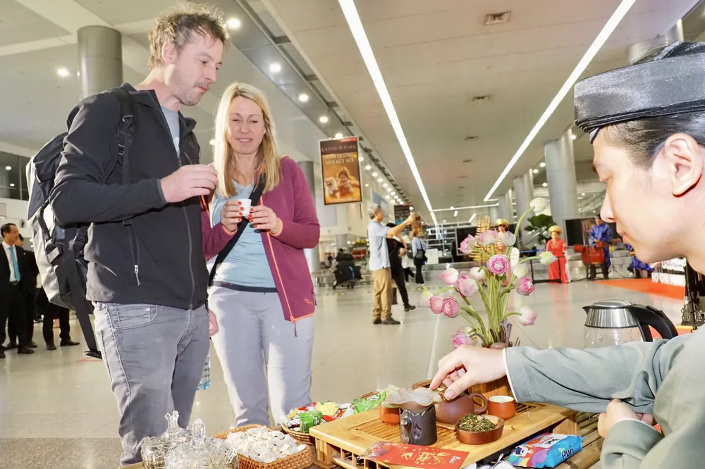 Ngay khi đặt chân đến sân bay Tân Sơn Nhất, đoàn khách đã nhận được niềm vui bất ngờ với các hoạt động trải nghiệm thú vị như: chiêm ngưỡng các màn biểu diễn nhạc cụ dân tộc, thưởng thức trà đạo, thưởng lãm thư pháp trên liễn chúc tết, tò he, vẽ trang trí quạt giấy. Ngoài ra, Ban tổ chức sự kiện cũng dành tặng những vị khách quý “xông đất” dịp đầu năm mới những món quà xinh xắn.