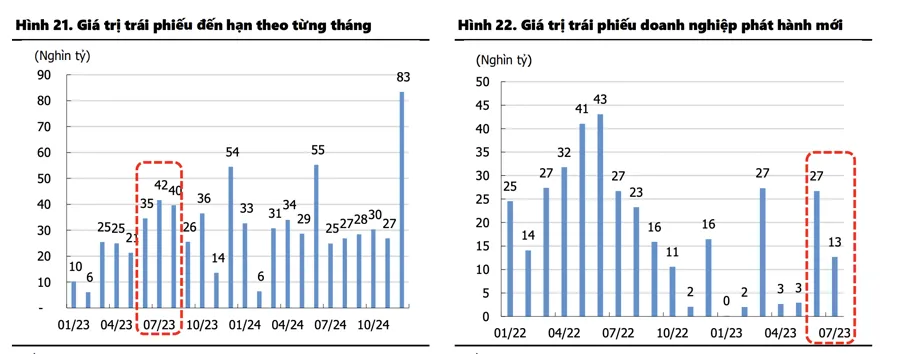 Một số lượng đáng kể trái phiếu doanh nghiệp dự kiến sẽ đáo hạn từ tháng 6 đến tháng 8. Cụ thể hơn, trái phiếu đến hạn dự kiến đạt 35 nghìn tỷ đồng trong tháng 6, 42 nghìn tỷ đồng vào tháng 7 và 40 nghìn tỷ đồng vào tháng 8. Trong đó, ngành Bất động sản là ngành chịu áp lực tài chính rõ rệt nhất do giá trị của trái phiếu đến hạn trong ngành là rất lớn. Theo đó, chỉ tính riêng ngành Bất động sản đã có đến 109 nghìn tỷ đồng trái phiếu sẽ đáo hạn trong 7 tháng cuối năm, chiếm hơn 44% tổng giá trị trái phiếu đáo hạn của thị trường.