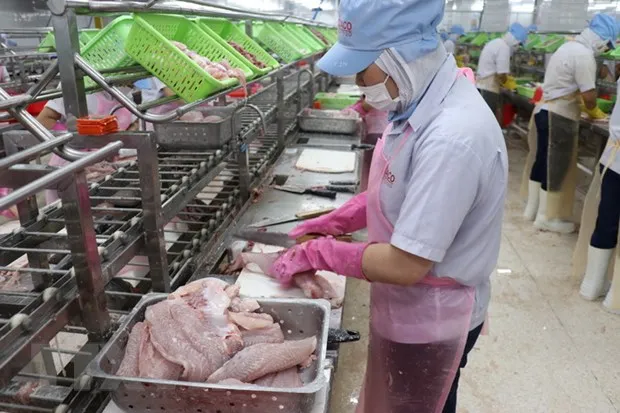 Công nhân nhà máy GODACO tại Khu công nghiệp Mỹ Tho, tỉnh Tiền Giang đang làm đơn hàng cá tra. (Ảnh: Minh Hưng/TTXVN)