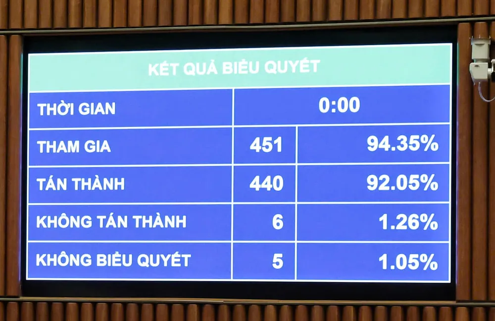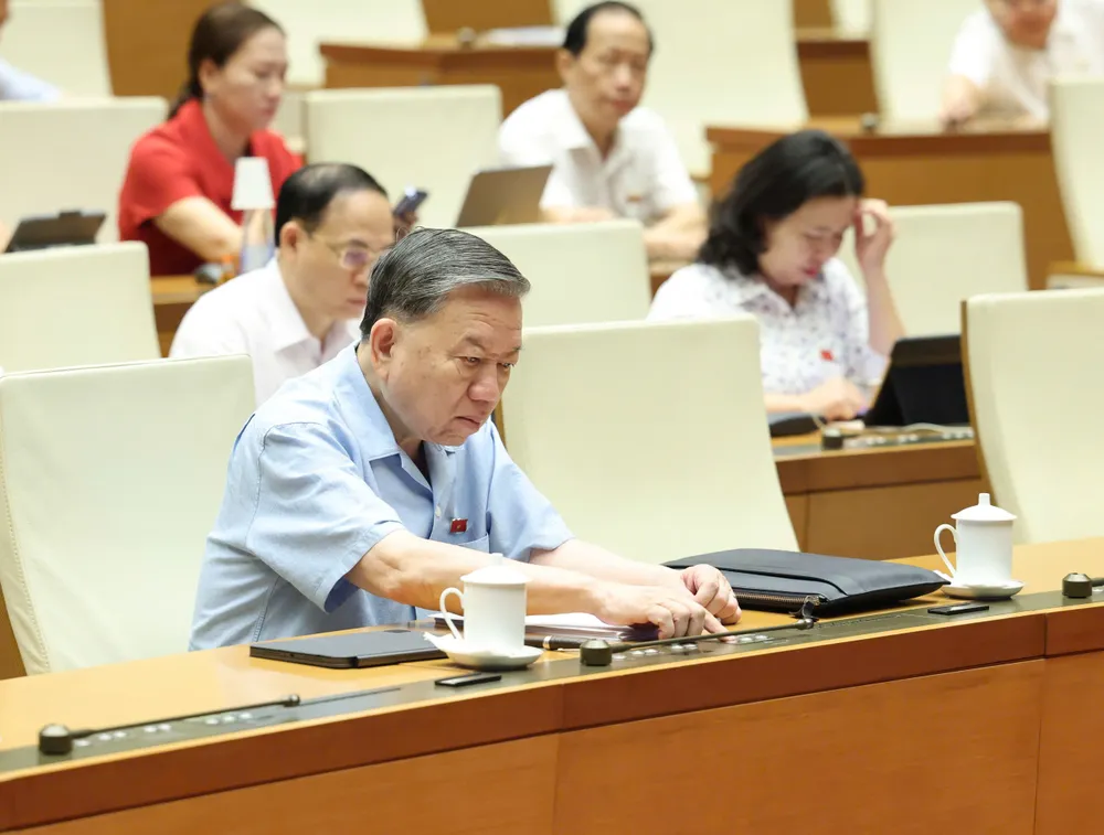 Tổng Bí thư Tô Lâm và các đại biểu Quốc hội bấm nút biểu quyết thông qua các luật, sáng 14-6. Ảnh: QUANG PHÚC