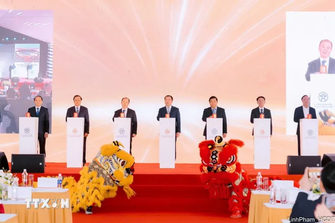 Các đại biểu thực hiện nghi thức khởi công Dự án khu đô thị đa mục tiêu xã Thư Lâm, xã Đông Anh. (Ảnh: Nguyễn Thắng/TTXVN)
