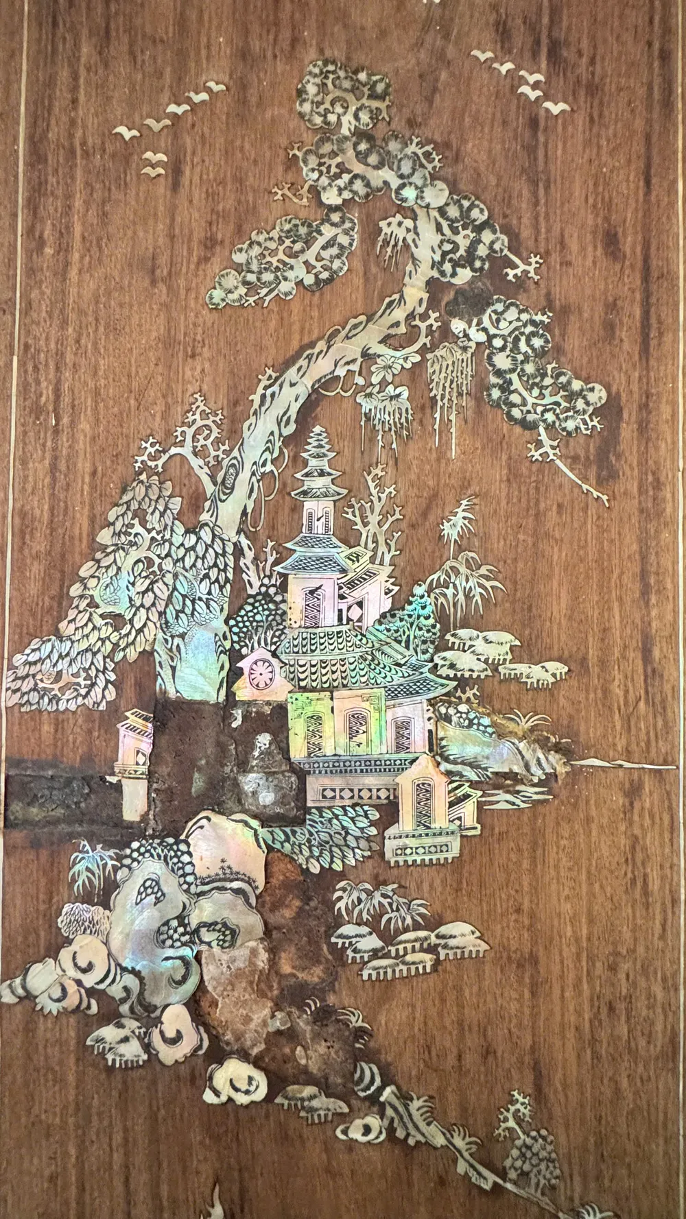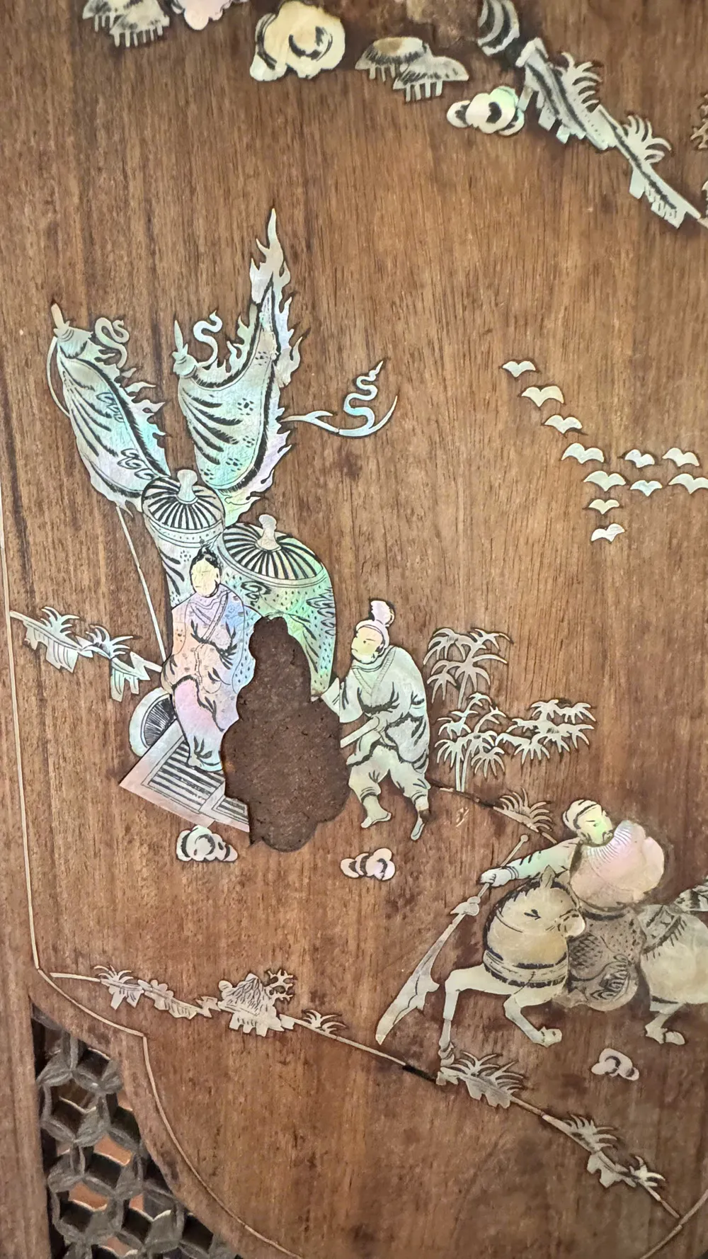 Trong nhà cổ ông Kiệt còn lưu giữ nhiều đồ cổ quý như bộ liễn đối khảm xà cừ, bộ bàn ghế với các hoa văn tinh tế...