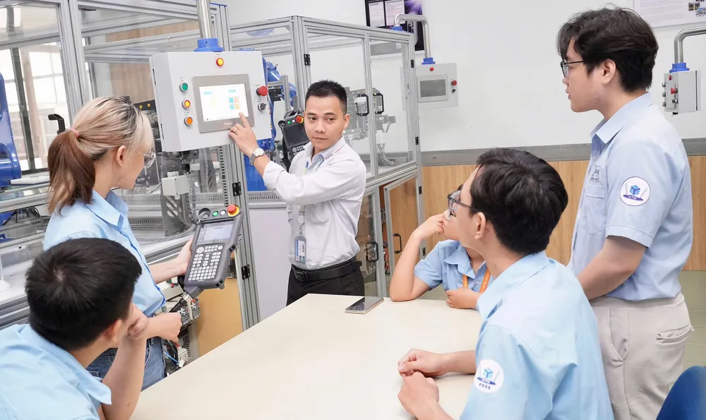 Sinh viên Trường Đại học Sư phạm Kỹ thuật TPHCM trong giờ thực hành tự động hóa. Ảnh: HOÀNG HÙNG