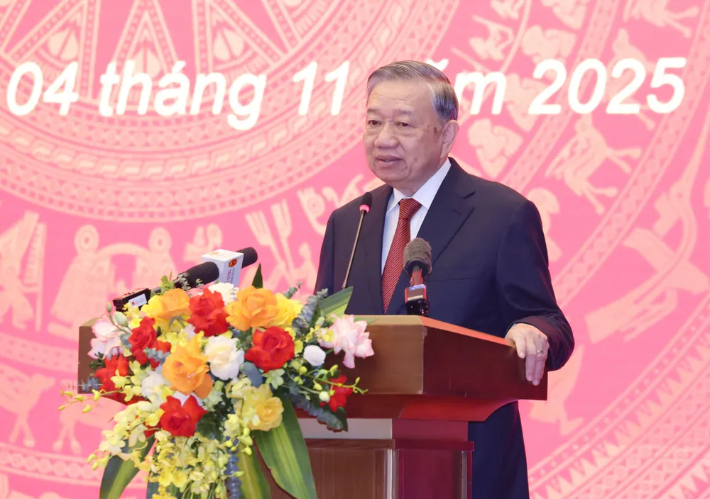 Tổng Bí thư Tô Lâm Phát biểu chỉ đạo và giao nhiệm vụ cho đồng chí Đỗ Văn Chiến. Ảnh: QUANG PHÚC