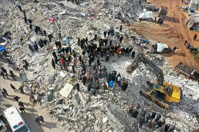 Lực lượng cứu hộ và tình nguyện viên tìm kiếm các nạn nhân và người sống sót mắc kẹt trong đống đổ nát sau động đất mạnh ở làng Besnia, gần thị trấn Harim, tỉnh Idlib (Syria), giáp biên giới Thổ Nhĩ Kỳ. Ảnh: AFP/TTXVN