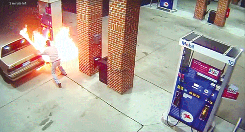 Trong một video clip do camera an ninh ghi lại, người ta có thể thấy người đàn ông đang đổ gas, bất thình lình cho tay vào túi móc chiếc bật lửa và bật lên. Ngọn lửa ngay lập tức bùng lên bao quanh cây gas và chiếc xe. Nhân viên trạm gas đã quát lên: “Bộ anh không biết gas dễ cháy nổ à?”.