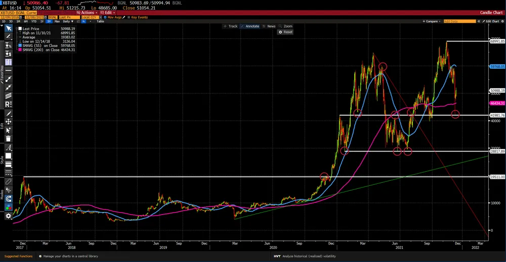 Đường trung bình động đơn giản (SMA) 55 ngày cũng có thể gây cản trở vào năm 2022. Sau mỗi đợt tăng vào năm 2021, giá lại giảm dưới đường SMA 55 ngày, đường SMA này sẽ chuyển thành kháng cự. Trong khi đó, SMA 200 ngày là dấu hiệu giảm giá. Do vậy, cả hai đều có thể giúp xác định thời gian hoạt động của Bitcoin trong tương lai.
