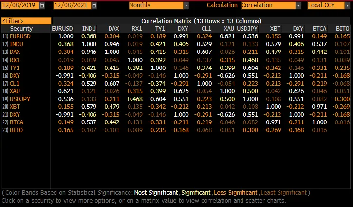 Quan sát ma trận tương quan cho thấy Bitcoin có quan hệ rất chặt chẽ với Dow Jones Industrial (DJI). Khi cổ phiếu Hoa Kỳ tạo ra mức cao nhất mọi thời đại mới hoặc đang ở mức cao, khoảng 60% (tương quan 0,579) thời gian BTC cũng ở trong màu xanh.