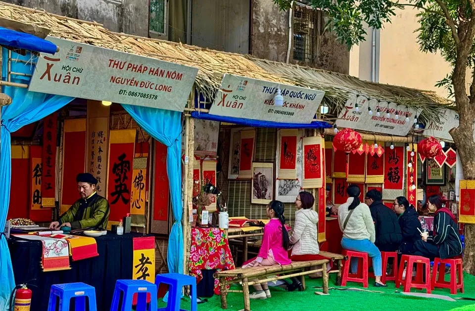 Đặc biệt, vào những ngày đầu xuân, Văn Miếu - Quốc Tử Giám, biểu tượng của trí tuệ và học vấn, trở thành điểm đến linh thiêng thu hút hàng ngàn người từ khắp nơi đổ về để xin chữ, cầu mong sự thành công, học hành tiến bộ và cuộc sống an lành. Xin chữ đầu năm không chỉ là một hành động mang tính tâm linh mà còn là sự giao thoa giữa văn hóa và nghệ thuật thư pháp. Những ông đồ già với nét bút tài hoa, uyển chuyển viết nên những con chữ Hán, Nôm hay Quốc ngữ mang ý nghĩa sâu sắc như "Tâm", "Đức", "Trí", "Phúc", "Lộc", "Thọ"…