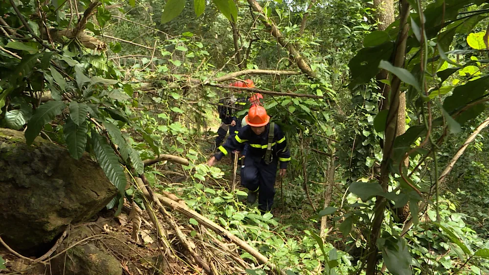 Lực lượng chức năng lội rừng để đến bãi Sủng Cỏ