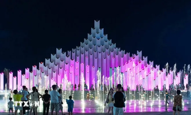 Tháp Tam Thắng gồm hơn 143 trụ tháp, cao từ hơn 3m đến hơn 30m, kết hợp hài hòa với đài phun nước và hệ thống chiếu sáng nghệ thuật lung linh vào ban đêm. (Ảnh: Huỳnh Sơn/TTXVN)