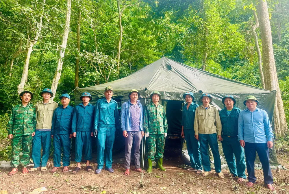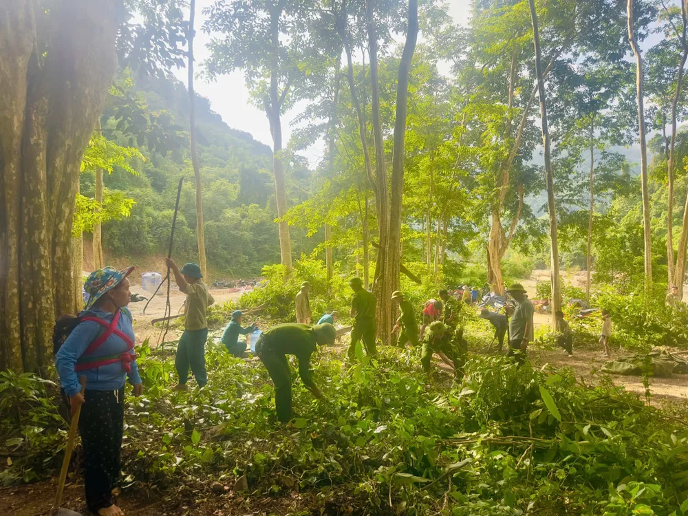Lực lượng chức năng cùng bà con tiến hành phát mặt bằng để dựng nhà bạt tạm. Ảnh: địa phương cung cấp