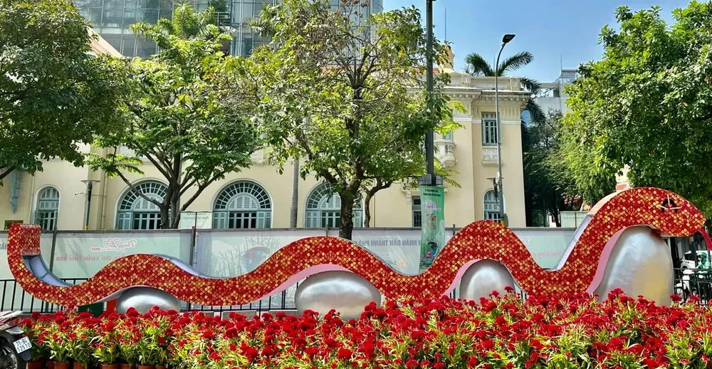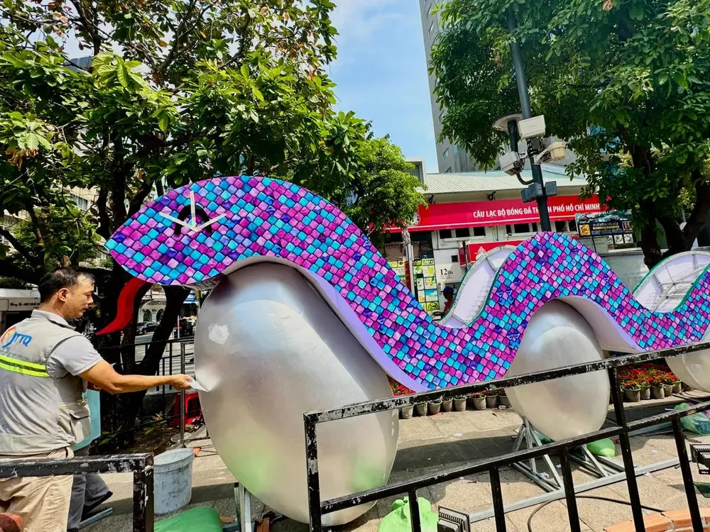 Bên cạnh sự xuất hiện của các linh vật rắn, nhiều đại cảnh, tiểu cảnh độc đáo cũng đang được hoàn thiện công đoạn cuối cùng. Anh Ngô Minh Quốc, đến từ đơn vị phụ trách dàn dựng đại cảnh Đường hoa Nguyễn Huệ cho biết, ekip của anh đã hoàn thành vượt tiến độ, sáng ngày 22/1 đã tiến hành bàn giao lại cho đội ngũ trang trí tiếp tục công việc.