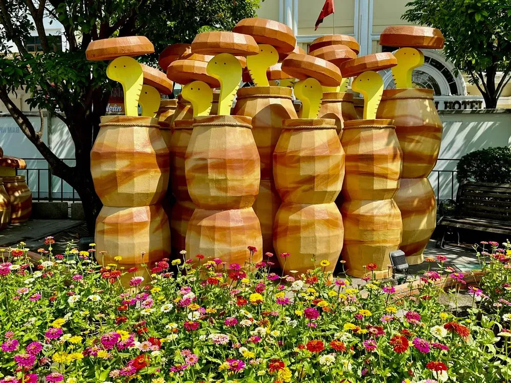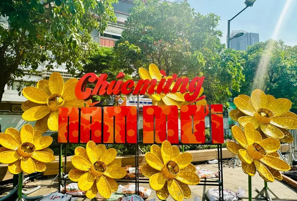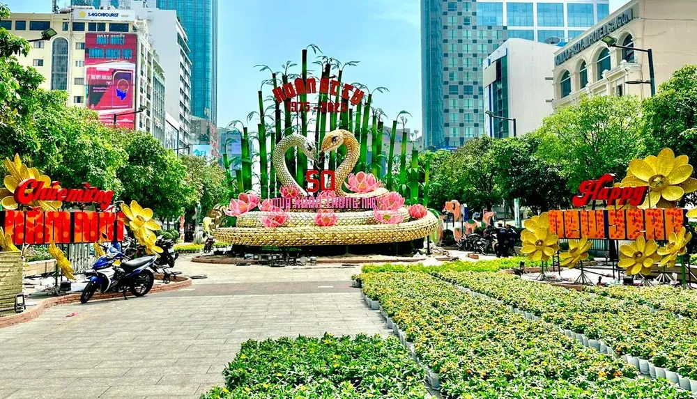 Với chủ đề Non sông gấm hoa, vui xuân thái hòa Đường hoa Nguyễn Huệ dần lộ diện. Cặp đôi linh vật Kim Tỵ và Ngân Tỵ đã xuất hiện đầy ấn tượng ngay cổng vào thu hút sự chú ý của đông đảo người dân và du khách.