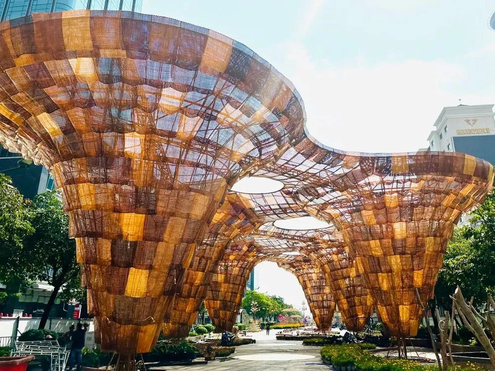 Đại cảnh “Giọt Xuân từ đất” có hình dáng giống hình tổ ong, được lấy lấy cảm hứng từ động thạch nhũ với hàng ngàn tấm ốp mây tre đan thưa đã được sử dụng làm trần và cột của hang động