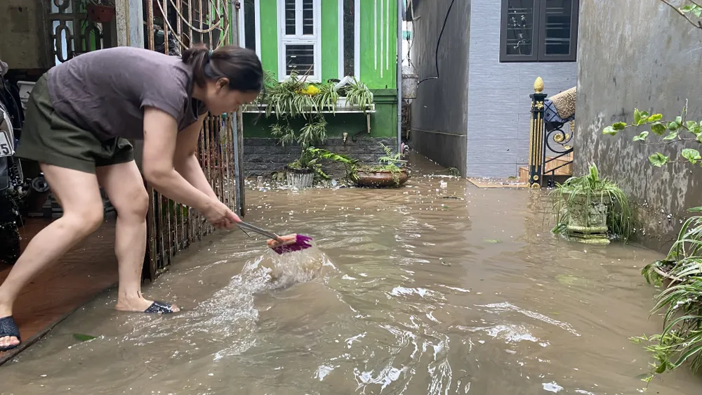 Nước mưa trên đồi tràn xuống nhà dân ở khu 1 sáng 8-9. Ảnh: VĂN PHÚC