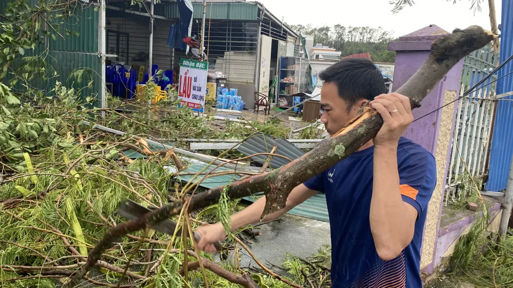 Hai bên đường, người dân đang dọn những mảnh tôn sập, cưa những cành cây chắn ngang cửa…