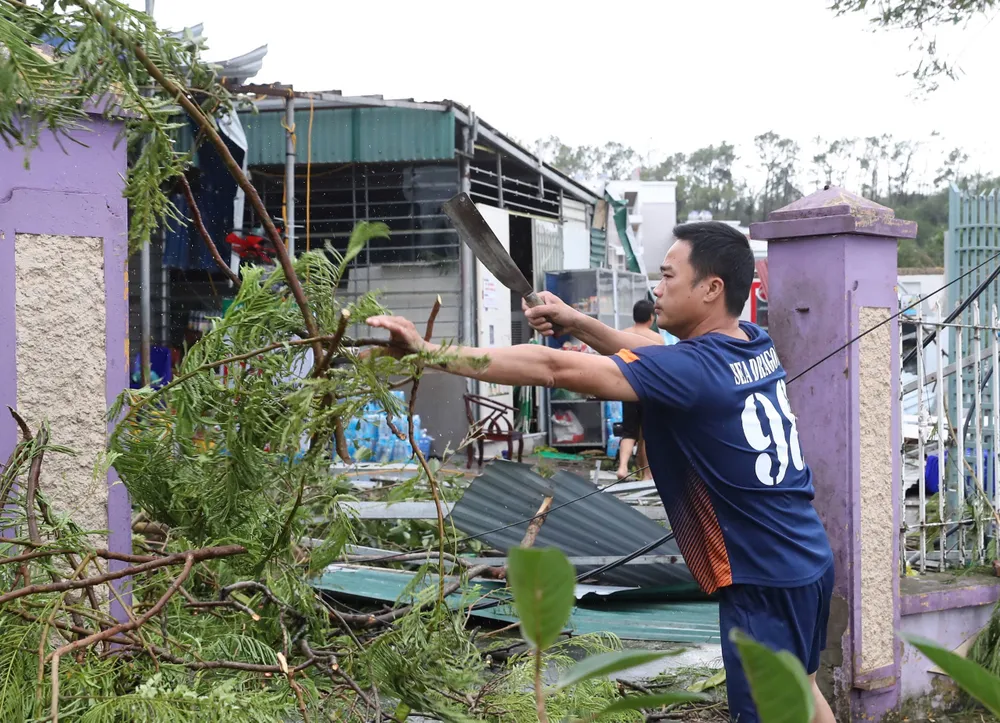 Người dân ở khu Vụng Hương dọn dẹp cây cối đổ vào mái nhà. Ảnh: QUANG PHÚC