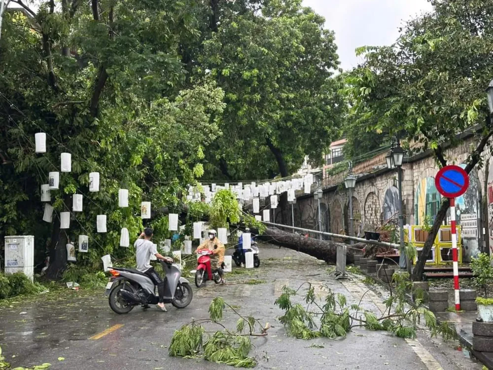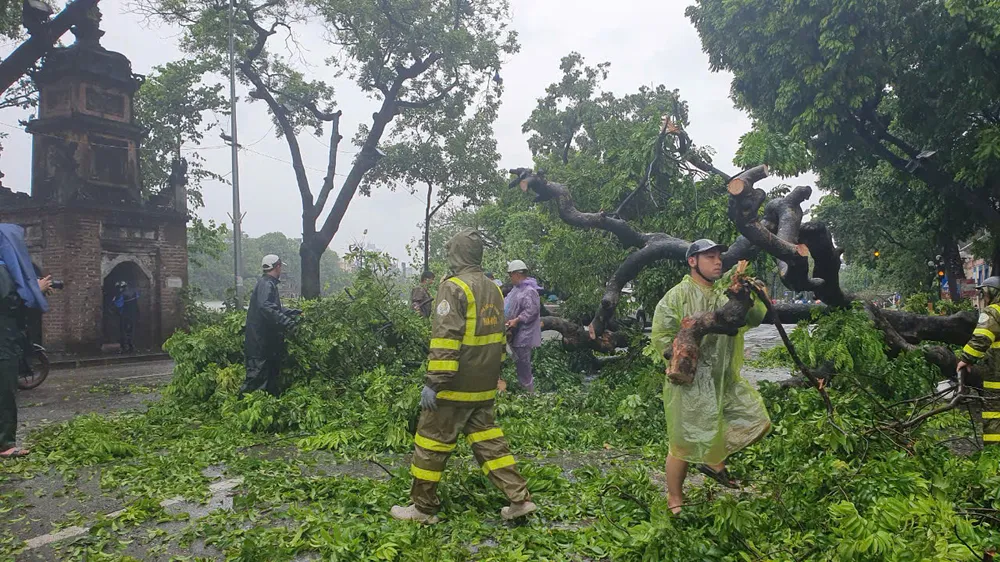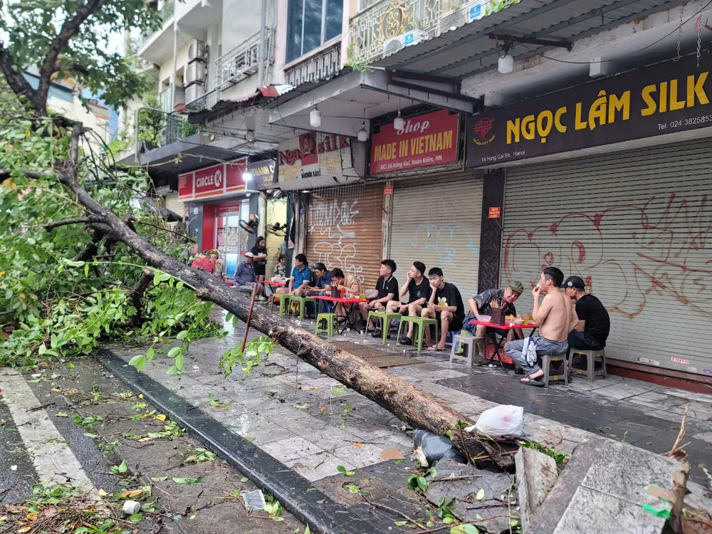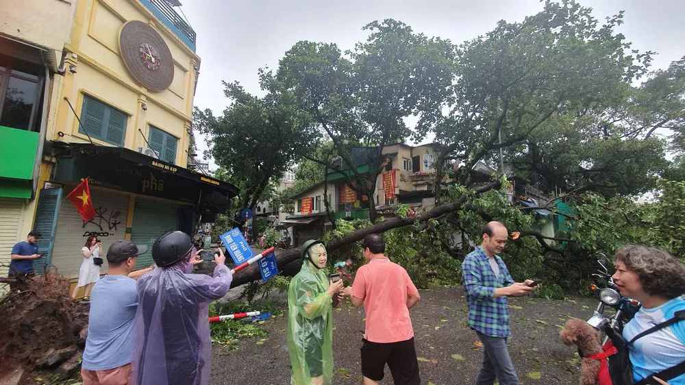 Tại khu vực xung quanh hồ Hoàn Kiếm, khung cảnh rất xác xơ khi nhiều cây xanh, thậm chí là những cây cổ thụ bị đổ ra đường gây cản trở giao thông, khiến các lực lượng chức năng rất vất vả để thu dọn.