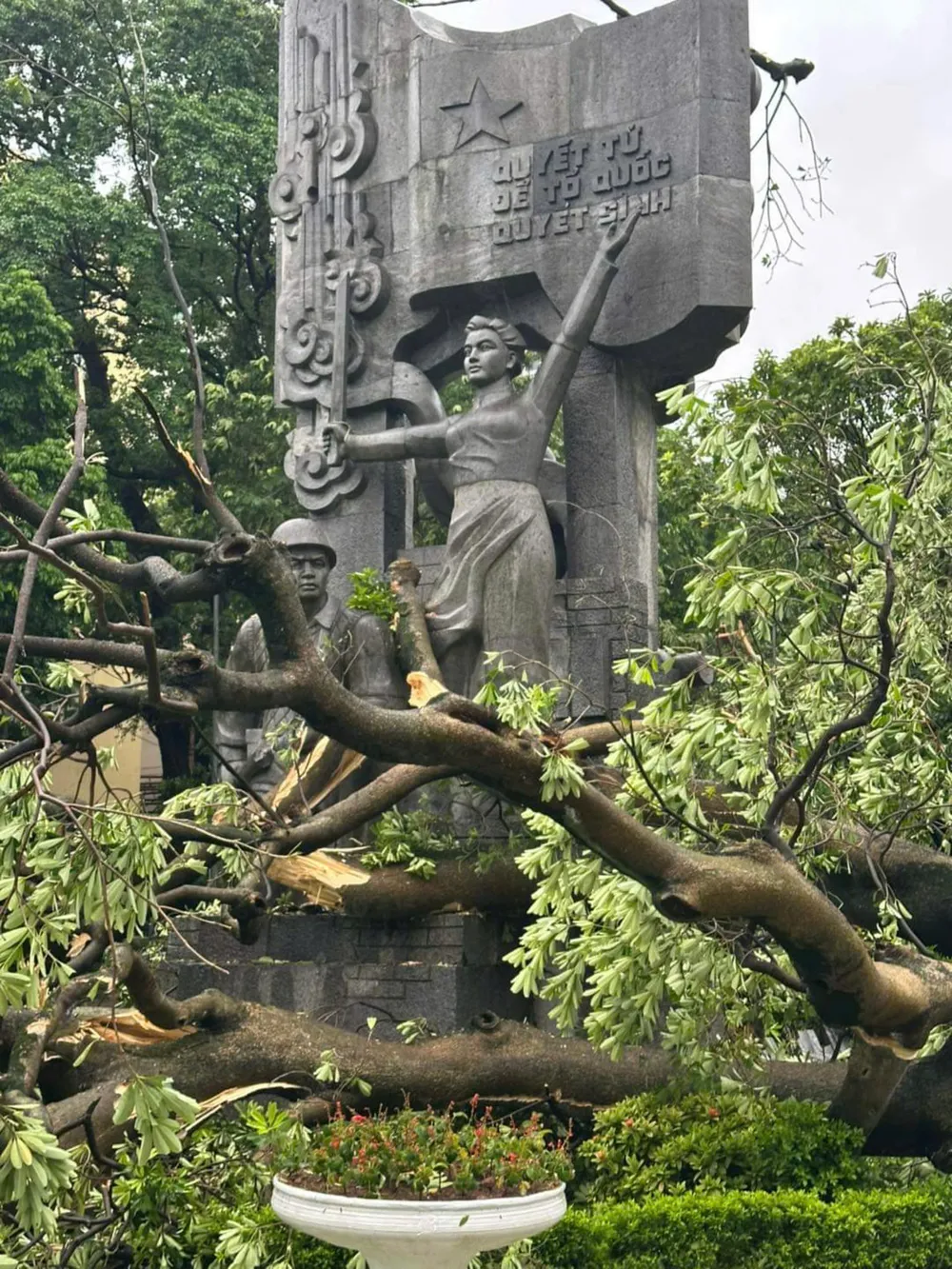 Cây xanh bị đổ trước Tượng đài Quyết tử cho Tổ quốc quyết sinh bên cạnh đền Bà Kiệu