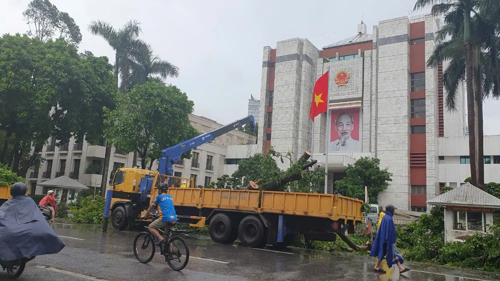 Trước cổng UBND TP Hà Nội cũng có rất nhiều cây xanh bị đổ đang được lực lượng chức năng dọn dẹp. Ảnh: QUỐC KHÁNH
