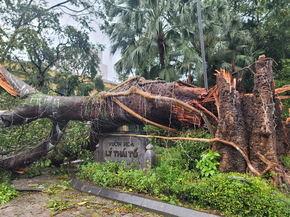 Một cây xanh cổ thụ bị gió bão bẽ gãy ngay trước vườn hoa Lý Thái Tổ. Ảnh: QUỐC KHÁNH