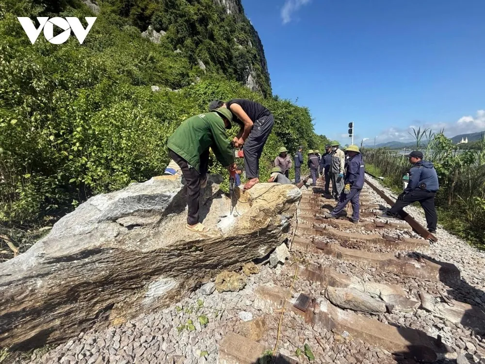 “Tại các khu gian 1 bên là núi, 1 bên là sông thì địa hình rất hiểm trở. Sau những cơn mưa rồi trời nắng, thay đổi thời tiết thì có tình trạng đá ở trên rơi xuống. Các đơn vị tập trung nhân lực, phương tiện máy móc thiết bị để giải phóng các khối đá rơi nằm trong làn đường sắt và giải phóng số tảng đá nằm ở 2 bên vi phạm khổ giới hạn đường sắt. Đến 10 giờ 55 phút, đã thông đường”, ông Trần Ngọc Sơn thông tin.