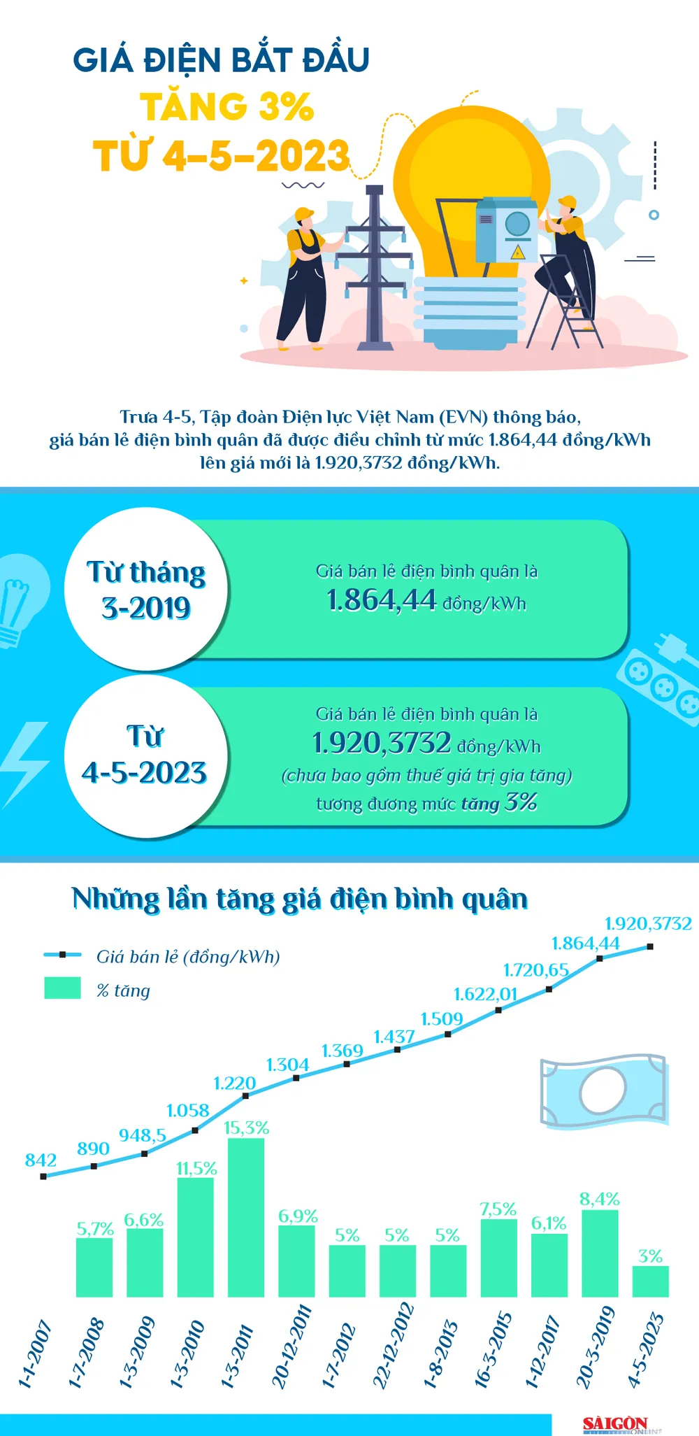 Theo đó, giá bán lẻ điện bình quân là 1.920,3732 đồng/kWh (chưa bao gồm thuế giá trị gia tăng) bắt đầu từ 4-5-2023. Mức điều chỉnh này tương đương mức tăng 3% so với giá điện bán lẻ bình quân hiện hành.