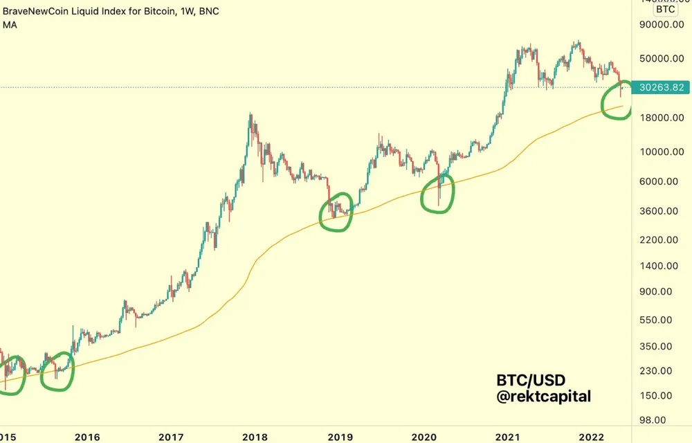 Rekt Capital cho biết: “Về mặt lịch sử, #BTC có xu hướng tạo đáy hoặc dưới đường 200-MA (màu cam). Do đó, đường MA 200 có xu hướng mang lại cơ hội với ROI vượt trội cho các nhà đầu tư $BTC (màu xanh lá cây). [...] Liệu BTC có thực sự đạt đến mức hỗ trợ 200 MA ... Sẽ là khôn ngoan nếu bạn chú ý đến nó”.