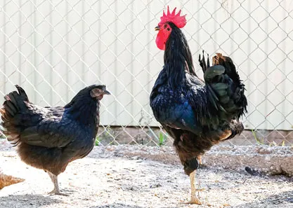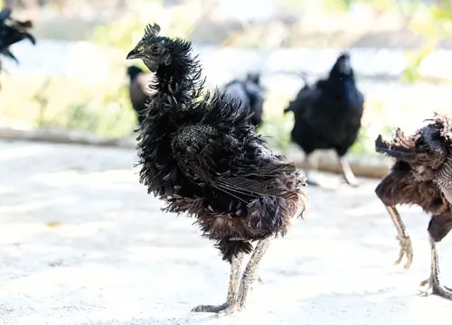 Gà đen Ayam Cemani nhập từ đảo Java, Indonesia. Giống gà này có màu đen từ nội tạng ra ngoài, giá khoảng 50 triệu đồng/con.