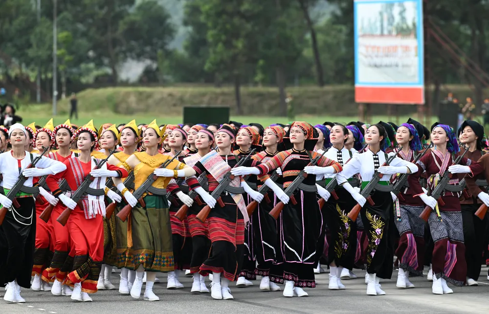 Khối nữ dân quân tự vệ các dân tộc Việt Nam tham gia tổng hợp luyện. Ảnh: ĐỖ TRUNG