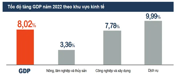Điểm sáng là khu vực dịch vụ với sự khôi phục và tăng trưởng mạnh mẽ, tốc độ tăng năm 2022 đạt 9,99%, cao nhất trong giai đoạn 2011-2022.