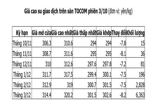 Hôm nay (3-10), cao su giao tháng 3-2012 tại Sở Giao dịch hàng hóa Tokyo (TOCOM) khớp giá 302,6 yen/kg tương đương 3.932USD/tấn. Như vậy, giá đã giảm 8,2 yen/kg hay 2,7% so với phiên trước quay về mốc thấp nhất 1 năm lập đầu tuần trước.