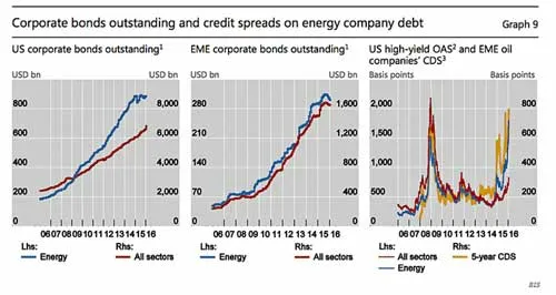 Theo một nghiên cứu của Jaime Caruana của BIS (Ngân hàng Thanh toán quốc tế), các khoản nợ đang lưu hành của công ty dầu và khí đốt trên toàn cầu tăng từ 455 tỷ USD vào năm 2006 lên mức 1.400 tỷ USD vào năm 2014. Trong thời gian này, các khoản vay tổng hợp (syndicated loans) của lĩnh vực dầu khí tăng từ 600 tỷ USD lên 1.600 tỷ USD.